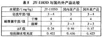 在pH值7~8,水硬度為100~150mg/kg,皂洗劑用量1g/L,皂洗溫度70℃,時間20min條件下,將JY一1103D與國內外同類產品進行比較,結果見表5。