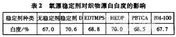 由表2可以看出,加人穩定劑D、EDTMPS和HEDP的試樣白度較高。這是由于漂液中加入這3種穩定劑之后,雙氧水的分解速率得到了有效控制,雙氧水在總的漂白時間內保持了較高的氧化能力。雖然穩定劑HEDP對雙氧水的穩定性較差,但漂白后試樣白度較高。這主要是由于HEDP本身酸性較強,在調節工作液pH值的過程中加入大量堿劑所致。綜合考慮,在后續試驗中選擇穩定劑D作為氧漂穩定劑,其質量濃度為2g/L。