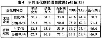 由表4可以看出,不加入穩定劑時,在8O℃、pH值11條件下,不論是否加人活化劑,試樣均有較高的雙氧水分解率,達到85%以上。而當漂液中加入穩定劑以后,織物白度明顯提高,雙氧水的分解得到了有效控制,漂白能力提高。從表4還可以看出,活化劑S有更明顯的促漂作用,尤其是當加人穩定劑之后,加入活化劑S的試樣白度比其它試樣要高1O個百分點。因此,漂白條件為80℃、pH值11時,選用活化劑S。