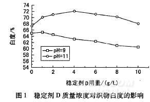 當pH值1l時,隨著穩定劑質量濃度的增加,織物白度逐漸升高,在質量濃度為4g/L時,白度達到最大值,穩定劑質量濃度繼續增加,織物白度開始下降。這是由于pH值為11時,漂液堿性較強,大量OH一的存在,使得雙氧水分解迅速,而穩定劑的存在可以有效控制雙氧水的分解速率,使雙氧水在總的漂白時間內保持較高的氧化能力,對織物進行充分的漂白。但如果穩定劑的加入量過大,會使雙氧水分解速率過慢,影響漂白的效率。因此,穩定劑D質量濃度可選擇為4g/L左右。