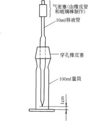 加入30ml已知硬度水(1000mg/kg),蓋上量簡塞子后如前進行混合,重復操作5次。然后將量筒放在恒溫水浴中,在溫度(40±0.5)℃下保持5min,如前再次混合,重復操作5次。然后將一支上端用氣密塞密閉的l0ml移液管,放置量筒中,使尖嘴離量筒底部約lcm(圖1)。