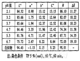 表l中,處理后的棉織物呈米黃色。△E隨著pH值的增加而增加,L隨著pH值的增加而減小,處理后織物的色深隨pH值的增加而相應增加。這表明隨著pH值的不斷增加,酚羥基的離解和氧化程度越來越大,這與圖1的結果是一致的。
