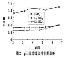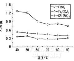 經硫酸亞鐵媒染后,織物的K/S值隨著溫度的升高而呈降低的趨勢,但趨勢減緩。原因是隨著溫度的升高,茶多酚對棉織物的親和力降低,使棉織物上茶多酚的吸附量減少,導致媒染生成的茶多酚/亞鐵絡合物數量減少。但是,織物經硫酸鐵和硫酸鋁鉀媒染后,其K/S值隨溫度的升高而略微降低。這可能與金屬離子和茶多酚絡合的配位數是一定的有關,也與吸附在纖維上金屬離子的數量有關。
