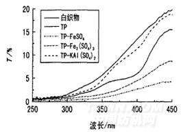 圖6表明,經茶多酚單獨處理后,棉織物的透過率明顯下降,這主要是因為茶多酚本身具有吸收紫外線的能力(圖1a)。以硫酸亞鐵和硫酸鐵為媒染劑,后媒法染色后棉織物的紫外線透過率減少得更多;就硫酸鋁鉀而言,染色后棉織物的紫外線透過率降低得少。這與不同金屬離子媒染生成的茶多酚絡合物的結構有關。