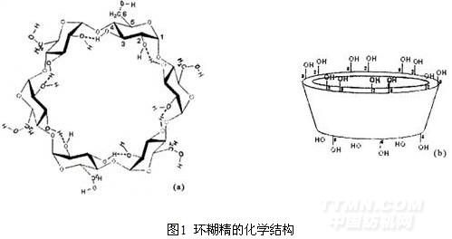 是六個以上葡萄糖分子以α—1,4糖苷連接的環狀低聚物,其中葡萄糖殘基呈4C1椅式結構如圖(9)1(a)所示。最常見的是α—環糊精(r—CD),β—環糊精(β—CD)和γ—環精精(γ—CD);分別由六個、七個和八個葡萄糖分子構成。經X—射線衍射和核磁共振研究證明:環糊精的立體結構是中空兩端開口的錐形園環形(或稱喇叭形環)如圖1(b)所示。呈近似Cn軸對稱,結構穩定,不易受酸、矸、酶和熱作用而分解。
