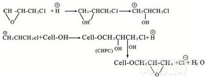 第一步是纖維素纖維(Cell-OH)在NaOH溶液中與環氧氯丙烷生成環氧化纖維素纖維,這是環氧氯丙烷分子中的氧原子非常活潑;在親電試劑(H+)作用下,極易生成不穩定的環氧氯丙烷正離子的中間體,而轉化3氯-2羥基丙基正碳離子,由它取代纖維素上的H+而得3-氯-2羥基丙氧基纖維素(CHPC),CHPC發生閉環反應得到環氧化纖維素纖維。