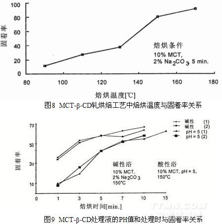 MCT-β-CD可用軋烘焙工藝處理,使之錨固在棉織物上。據資料介紹(36),焙烘溫度150℃處理3~5分鐘已足夠,如圖8所示,而處理浴的PH值影響如圖9所示