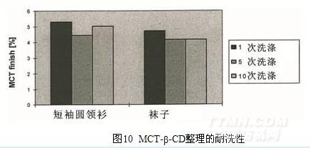 經5%MCT-β-CD整理的短袖圓領衫和襪子,在60℃洗滌液中按通常洗滌條件,洗1、5和10次后,未發現MCT-β-CD固著量有明顯的降低,如圖10所示