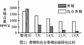 將薰衣草香精和β—環糊精包合薰衣草處理織物,放置在自然條件曝露于空氣中,每隔一星期,用乙醇萃取,將濾液在UV-3000紫外分光光度計上,入max(276nm)下測定其吸光度,則香精與包合香精處理的緩釋性能如圖11所示(38)