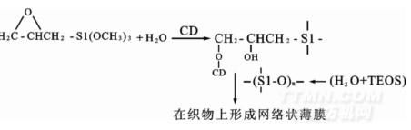 溶膠—凝膠法是用無機鹽或金屬烷氧基化合物為前驅物,將前驅物溶于溶劑(水或有機溶劑)中,通過在溶劑中發生水解或醇解而形成溶膠(或經改性的溶膠),涂布于基質,通過干燥使溶膠轉變成凝膠(一層多孔結構氧化物干凝膠膜)。可用于錨固環糊精的溶膠是以金屬有機物為前驅體的。例如:正硅酸乙酯(TEOS)和少量3—縮水甘油醚三甲氧基硅烷(GPTMS)作為改性劑,在乙醇和水溶液中進行控制性水解,通過分子簇的縮聚形成改無機聚合溶膠,也可將環糊精加入共同反應。此時,可能作為改性劑的GPTMS與環糊精之間會有下列反應;同時與TEOS水解物共同形成網絡狀凝膠。