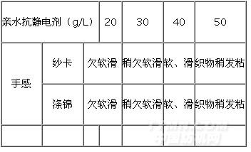 4.2親水抗靜電劑的不同用量對織物手感的影響(結(jié)果見表2):