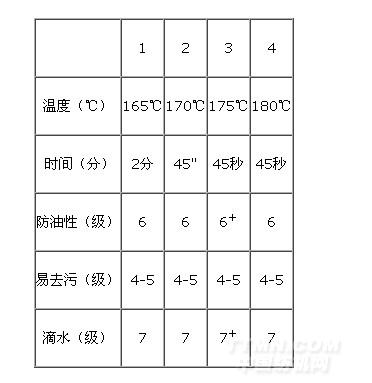 2.3.2.2焙烘溫度和時間直接影響三防和易去污的效果,我們通過試驗確定三防整理劑HPC-6的合適的工藝,試驗結果見下表。