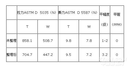 無醛樹脂WSD系統,樹脂用量150~160g/L,焙烘溫度160-165度,時間40-50秒,可達到整理后平整度3級以上,降強在15%左右,且布面不含甲醛的良好效果。本系統柔軟劑和纖維保護劑的加入不僅可以改善織物的強力,而且賦予織物極佳的懸垂性,柔軟豐滿的手感,進一步提高面料的檔次。使用這套系統整理的面料符合當前綠色環保的理念及流行的趨勢,有著廣闊的市場前景。