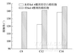 采用辛基三甲氧基硅烷(C8)、十二烷基三甲氧基硅烷(C12)和十六烷基三甲氧基硅烷(C16)分別作為低表面張力物質賦予棉織物拒水性。將未經Sol 4整理的空白棉織物和經Sol 4整理的棉織物浸漬在2%的不同結構硅氧烷的水解液中,織物與水的接觸角變化見圖2。