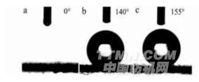 圖3表明,盡管使用的硅氧烷碳鏈長度不一樣,但其變化趨勢相似。當硅氧烷的質量分數從0提高到0.5%時,接觸角明顯增大,隨著質量分數的增加,接觸角變化較為緩和。當質量分數達到3%~4%時,接觸角變化不明顯,拒水效果趨于穩定。此外,由圖4可見,經Sol 4整理再浸漬3%C16水解液的棉織物與水的接觸角為155°,達到了超疏水效果。
