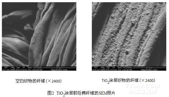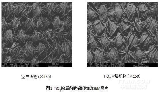 棉織物經TiO2涂層前后的SEM照片如圖1所示。由圖1可知,經TiO2涂層后,在織物表面形成了一層致密的PVDF-TiO2高分子膜,PVDF和TiO2填充了纖維交織點間空隙,使紗線結構變得較為緊密。