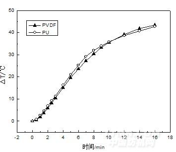 由圖7可知,在輻射時(shí)間內(nèi),PVDF基和PU基TiO2涂層織物的輻射時(shí)間——溫度變化曲線極為相似。所不同的是,在前10 min的輻射時(shí)間內(nèi),PU基TiO2涂層織物的內(nèi)側(cè)溫度增加量高于PVDF基的,PVDF基TiO2涂層織物的隔熱性能優(yōu)于PU基的;而輻射10 min后,PVDF基TiO2涂層織物的內(nèi)側(cè)溫度增加量高于PU基的,PU基TiO2涂層織物的隔熱性能優(yōu)于PVDF基的。這可能與PVDF基TiO2和PU基TiO2在織物上具有不同的分布狀態(tài)有關(guān)。PVDF基TiO2在織物上分布較密集,其在織物上的附著量明顯多于PU基TiO2的。在短的輻射時(shí)間內(nèi),由于PVDF基TiO2涂層織物表面附有一層密集的對(duì)熱輻射具有較強(qiáng)反射作用的TiO2,致使熱輻射較難透過織物進(jìn)入內(nèi)側(cè),形成累積,所以其隔熱性能較好。但經(jīng)較長(zhǎng)時(shí)間輻射后,由于PU基TiO2涂層織物和PVDF基TiO2涂層織物上的TiO2粒子對(duì)熱輻射具有同等的反射效果,而PVDF基TiO2涂層織物上富余的TiO2粒子會(huì)對(duì)熱輻射產(chǎn)生吸收,吸收的能量通過熱傳導(dǎo)進(jìn)入織物內(nèi)側(cè),形成累積,所以其內(nèi)側(cè)溫度增加較多,但區(qū)別不大。