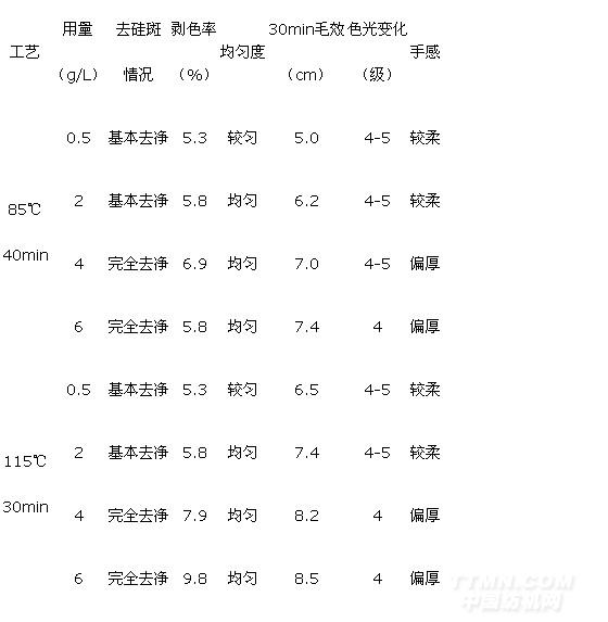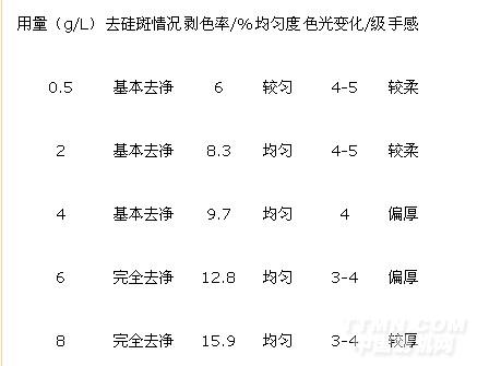 由表-1可知:DAJ-001的用量在4-6g/L時對織物上的硅斑有較好的去除效果。考慮到其他負面因素,DAJ-001的用量以4g/L為宜。
