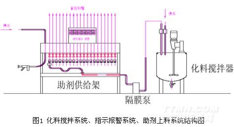 將高濃度或粉末狀染料或助劑與水按一定比例混合,攪拌,使其配置或稀釋成生產用染料或助劑,如圖1所示。