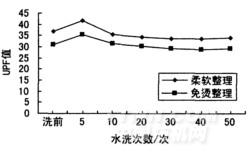 (2)防紫外線屎軟同浴整理織物和防紫外線/免燙同浴整理織物的耐水洗性能較好,50次水洗后,其UPF值僅分別下降7.4%和5.8%。