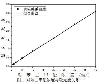 采用磷酸鹽緩沖液(3g/L磷酸二氫鉀和7g/L的磷酸氫二鈉)配制濃度分別為1,2,5,10,20,30,40mg/L的對苯二甲酸溶液(標準溶液),在紫外分光光度計上對所配制的對苯二甲酸溶液進行全波長掃描,確定其最大吸收波長在240nm,然后在240nm波長下,測定所述不同濃度的對苯二甲酸溶液的吸光度,對應濃度-吸光度繪制的曲線圖(參見圖1),找出其線性擬合度達標(擬合度達到0.99986)的濃度范圍為1-40mg/L,擬合得到線性方程(2):Y=0.08342+0.07584×X,其中X代表對苯二甲酸濃度,Y代表紫外吸光度,線性方程(2)用于計算對苯二甲酸降解過程中苯環含量的變化。
