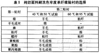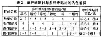 多纖維貼襯系由多種纖維組合而成,因其結構、紗和密度與單纖維貼襯不同,所以沾色效果也不同。常用的SDC多纖鄰布DW為例,按GB/T3921A(1)法試驗,比對結果見表2。