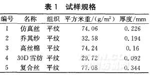 選取5塊不同種類的試樣,其規(guī)格見表1。試樣均按照《GB/T6529-2008紡織品調濕和試驗用標準大氣》進行測試取值。將試樣分別剪成直徑240mm的圓形,然后在這些圓形試樣的中心剪一個直徑約4~5mm的圓孔。進行靜態(tài)懸垂測試的試樣都在溫度為(20±2)oC,相對濕度65±4的條件下放置24h。