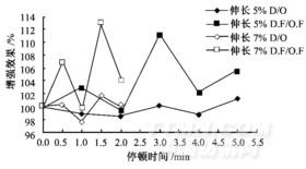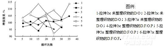 圖1-2中,D/O為織物拉伸停頓后的斷裂強度與直接拉伸斷裂強度之比的百分率:D.F/O.P表示拉伸織物整理后斷裂強度與織物直接整理后的斷裂強度之比的百分率。