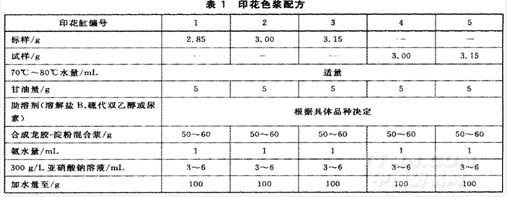 準確稱取染料標樣和試樣各若干克(稱準至0.00 05 g ),分別置于燒杯中,加70℃-80℃(個別的品種要求室溫)的水少許調成漿狀,續加一定量的水,攪拌使其充分溶解,然后加人甘油,根據需要續加助溶劑, 然后將燒杯置于托盤天平上,用加漿器加人規定量的合成龍膠一淀粉混合漿,攪拌均勻,加氨水1 ml調勻,再加人適量的300 g/L的亞硝酸鈉溶液,充分攪拌,待完全均勻后,靜置15 min,臨用時再攪拌、印花。