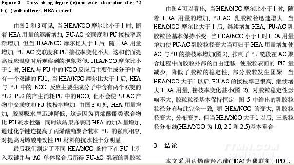 基丙烯酸甲酯、三羥甲基丙烷三丙烯酸酯為丙烯酸酯類單體,偶氮二異丁腈為引發劑合成了丙烯酸酯改性水性聚氨酯(PU-AC)乳液.建立并驗證了使用PU和PAC的共溶劑四氫呋喃測定產物的交聯度并計算PU對AC的接枝率.隨著反應溫度的提高,HEA與PU預聚體中NCO的反應性增加,體系中最終殘余NCO降低.變化HEA/NCO摩爾比,當HEA/NCO低于1時,增加HEA用量使PU接枝率和PU-AC乳膠粒徑逐漸增加;當HEA/NCO大于1后,繼續增加HEA用量對PU接枝率和PU-AC乳膠粒徑的影響不大.膠膜吸水率隨著HEA用量的增加而明顯降低.