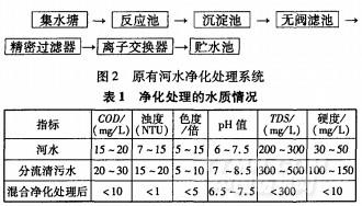 該企業(yè)原外排廢水約6000t/d,對三個主要色種(大紅、寶藍(lán)、翠綠)的染色過程進(jìn)行跟蹤分析,并測定每一工序外排水的水質(zhì)。結(jié)果表明,棉針織物染色后的洗溢流水工序及后續(xù)的5道水洗工序中,約有l(wèi)500m/d的排水COD低于30mg/L,色度低于5倍,與取水水質(zhì)相當(dāng)。基于這種情況,車間廢水實行清濁分流,將清污水部分分流至廠內(nèi)河水貯水塘,與河水混合后進(jìn)入原水凈化系統(tǒng)處理,凈化工藝見圖2。混合后清水經(jīng)凈化處理后水質(zhì)見表l。