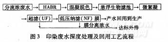 圖3印染廢水深度處理及回用工藝流程廢水經(jīng)高效低耗的HABR一混凝脫色懸浮生物濾池聯(lián)合工藝處理后,出水水質(zhì)優(yōu)于一級排放標(biāo)準(zhǔn);再采用微絮凝一超濾膜預(yù)處理工藝,以最大限度地降低廢水濁度、色度和有機(jī)污染物濃度,提高進(jìn)膜水質(zhì)要求;最后采用低壓NF膜分離技術(shù)脫除無機(jī)鹽和殘余的有機(jī)物,低成本地實現(xiàn)廢水的循環(huán)利用。