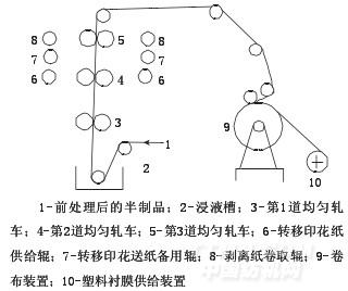 (5)混紡織物用轉(zhuǎn)移印花可獲得精美的印花效果,假如僅在合成纖維織物上印上花紋,而要洗去另一種紗線上的花紋,采用準(zhǔn)確的轉(zhuǎn)移印花紙就可以達到目的。但也可以同時印制不同的兩種紗線(如滌/棉交織物)。對于混紡纖維織物,在經(jīng)紗印花時,經(jīng)紗反面的印花質(zhì)量是100%,長絲變形紗<滌棉變形紗<滌綸長絲紗。