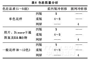 由表6色差質量分析,柔、凹版冷轉移印花皆優于圓網冷轉移印花。