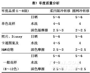 由表7可知,兩種不同介質印刷,日曬牢度相同,水洗、深色摩擦牢度,柔、凹版冷轉移優于圓網冷轉移印花。印花產品手感兩種工藝相同。