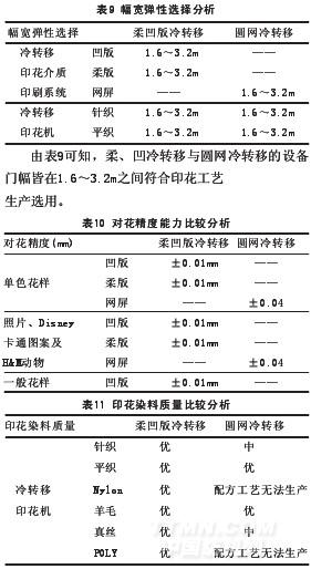 由表8可知,生產效益對比,冷轉移印花介質印刷系統,凹版、柔版與圓網產量比5:1、4:1;Cooltrans冷轉移印花機產量是丹麥聯合開發的轉移印花機2~3倍,紡織品種適應范圍寬得多。