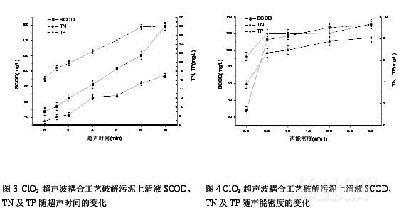 圖2 還顯示,當(dāng)ClO2投量達4mg/(g 干泥)后,繼續(xù)投加,SCOD 和TN 增加不明顯。這是因為在ClO2投量4mg/(g 干泥)時,對細胞壁的破壞作用已較強,胞內(nèi)物易于在超聲波的空化作用下溶出。而為了使TP 充分釋放,則需將ClO2投量增加至6mg/(g 干泥)。這可能是因為部分磷釋放自細胞膜的磷脂雙分子層結(jié)構(gòu),這部分磷僅靠超聲波的物理作用力作用無法釋放出來,只有增加ClO2投量,才能使這部分磷溶出。因此,僅從細胞破解的角度,ClO2-超聲波耦合破解污泥的最佳ClO2投量為4mg/(g 干泥)。