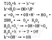 Ti02有3種晶體結(jié)構(gòu):板鈦礦型、銳鈦礦型、晶紅石型。催化活性的次序?yàn)椋轰J鈦礦型>晶紅石型>板鈦礦型。TiO2的禁帶寬度隨晶型不同而不同,銳鈦礦型的禁帶寬度為3.2eV、金紅石為3.0eV,相對(duì)應(yīng)的光譜吸收閥值為387nm和413nm。當(dāng)用波長低于上述波長的光照射TiO2時(shí),將從Ti0。體內(nèi)激發(fā)出自由電子(e-),從而在價(jià)帶上留下空穴(h,產(chǎn)生的電子(e-)和空穴(h)與其表面吸附的Oz/HzO等作用生成的·OH/·02有極強(qiáng)的氧化性,可氧化分解多種有機(jī)物,并且產(chǎn)生的自由電子有較強(qiáng)的還原能力,可還原金屬離子,故TiO2光催化技術(shù)在污水處理中表現(xiàn)出良好的光催化降解效果。其光催化原理如下所示:
