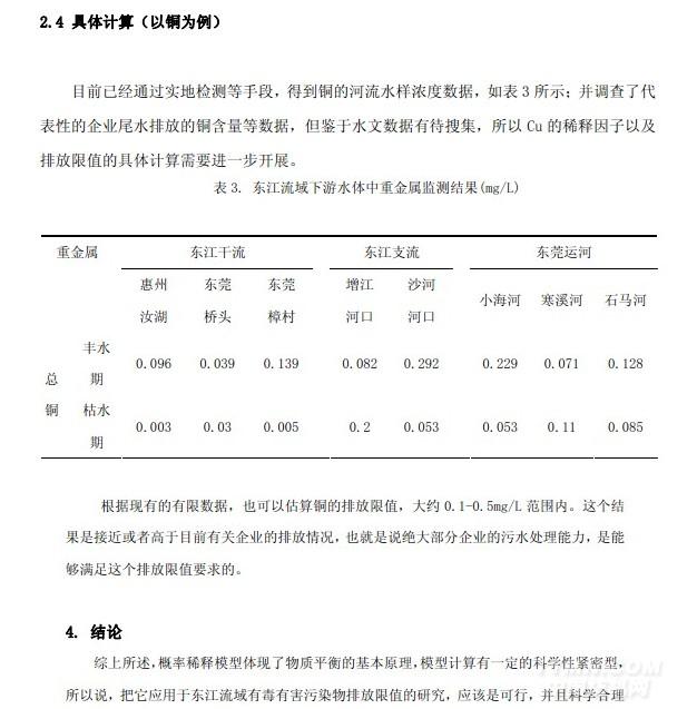 的。但由于水文資料未收集完整,計算仍缺乏足夠的基礎數據;具體計算和進一步的結果評價將在數據完善后進行。目前估算的銅排放限值,在 0.1-0.5 mg/L 范圍內,這是絕大部分企業的污水處理能力能夠滿足要求的。