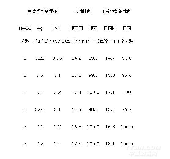 預先配制一定濃度的PVP(納米Ag的高分子分散劑)溶液,置于超聲波發生器內,機械攪拌下加入一定質量的納米Ag及少許106黏合劑(自交聯丙烯酸酯型),加去離子水至100mL。超聲波分散30min后,得到納米Ag分散懸浮液。最后加入一定量HACC的水溶液,得到Ag/HACC復合抗菌整理液。