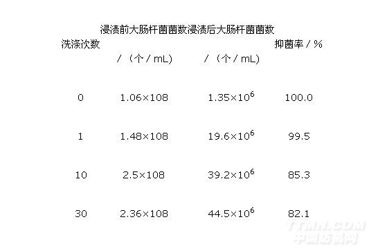 對(duì)經(jīng)Ag/HACC復(fù)合抗菌整理劑(1%HACC+ 0.1 g/L Ag+0.2g/L PVP)整理的純棉織物進(jìn)行耐洗試驗(yàn),結(jié)果見表3。