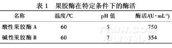 從表1中可以看出,在各自適宜的溫度、pH值、果膠質為底物的條件下,酸性果膠酶A的酶活是堿性果膠酶B酶活的2倍.