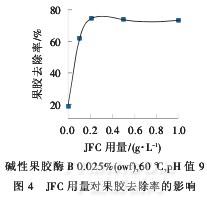 從圖4中可以看到,果膠去除率隨非離子表面活性劑JFC用量的增大而增大,當JFC用量達到0.2g/L時,堿性果膠酶B對果膠去除率穩定在75%左右,考慮到用量最省,JFC最佳用量為0.2g/L.JFC等非離子表面活性劑對堿性果膠酶B的這種影響,歸因于其可提高織物的潤濕性和酶在織物上的可移動性,使酶易于解吸及對底物的可及度,有利于酶向催化反應方向移動,從而增加了酶的活性.但當超過它們的臨界膠束濃度時,則使酶的活性降低.當不加JFC時,果膠去除率在20%左右.表明酶分子在棉纖維內的擴散對果膠的去除至關重要,如果酸性果膠酶A的分子質量過大,分子擴散受阻,其與底物的接觸機會減少,就有可能導致酶活高而果膠去除率很低的結果.