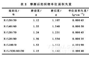設(shè)定摩擦次數(shù)為50次,計(jì)算摩擦后的織物單位面積失重,如表2所示。
