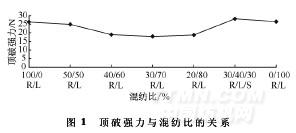 將第2組試樣固定在夾布圓環(huán)內(nèi),彈子按一定速度垂直頂向試樣,直至頂破,儀器自動(dòng)顯示頂破強(qiáng)度。每種織物取6塊試樣,測(cè)出各試樣的頂破強(qiáng)力,然后取平均值。同時(shí),在本次測(cè)試中加入同等規(guī)格的純拉伸細(xì)化羊毛(R/L,0/100)織物作為對(duì)比試樣,為不同混紡比的頂破強(qiáng)力試驗(yàn)提供參照。結(jié)果如圖1所示。