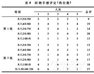 本文試驗采用主觀評定法中的秩位評定法,先由數名檢驗人員按各自的感覺對織物風格水平做出判斷,對織物風格的水平由高到低順序排隊,排隊順序號1,2,3…,n,即為秩位數(n為織物試樣總數)。然后將各檢驗人員對每種織物打出的秩位數相加得到總秩位數,最后根據總秩位數對這些織物風格的優劣水平進行相對比較,作出感官評價的結果,如表4所示。第1組試樣:5種試樣為由不同混紡比的原料所紡制的32tex×2的股線雙根喂入織成的平紋針織物;第2組試樣:6種試樣為由不同混紡比的原料所紡制的32tex單紗單根喂入織成的平紋針織物。
