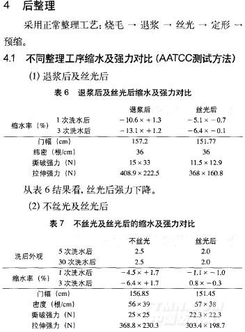 (4)后整理:面料毛羽多,調整燒毛工藝;縮水大,通過堿絲光進行改善;各工序張力宜偏小控制;后整理加色會產生牢度問題,此類品種不適合連續軋染加工。