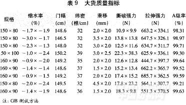 從表9可看出,大貨的縮水、滑移、撕破強力及拉伸強力等均能達到較高的物理指標,同時A級率達到平均99-3%。
