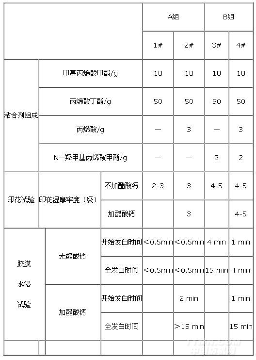 為檢驗(yàn)上述機(jī)理解釋是否正確,特設(shè)計(jì)‘證偽性實(shí)驗(yàn)’如下:對(duì)不可交聯(lián)型、自交鏈型兩類丙烯酸酯粘合劑,分別采取加或不加丙烯酸(含氫鍵單體)進(jìn)行對(duì)比。試驗(yàn)樣分別檢測(cè)膜的耐水性和涂料印花濕摩擦牢度。其次,在含有丙烯酸單體的粘合劑中,加用醋酸鈣,并檢測(cè)上述指標(biāo)。
