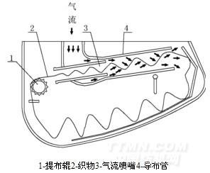 值得注意的是,織物在整個動程循環(huán)中,氣流噴嘴前的提布輥,并不起到牽引織物運行的主要作用,而是作為改變織物運行方向,減少阻力之用。織物在高速運行條件下,雖然提布輥有速度調(diào)節(jié)[變頻調(diào)速],但很難做到與氣流牽引織物的速度同步。這種速度差是客觀存在的。如果將該速度差控制在一定的范圍內(nèi),讓提布輥的線速度低于氣流牽引織物的速度,那么就如同旗桿拉住在風中飄揚的旗幟一樣,能夠產(chǎn)生劇烈的抖動。這恰恰為氣流對織物的作用,以及織物之間的揉搓提供來了有利條件。